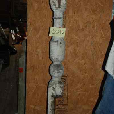 Pine newel post; appears to be exterior. Victorian, ca. 1870-1900. White paint; decorative base. Has large cracks and rotting, as well as cracking paint.Collection