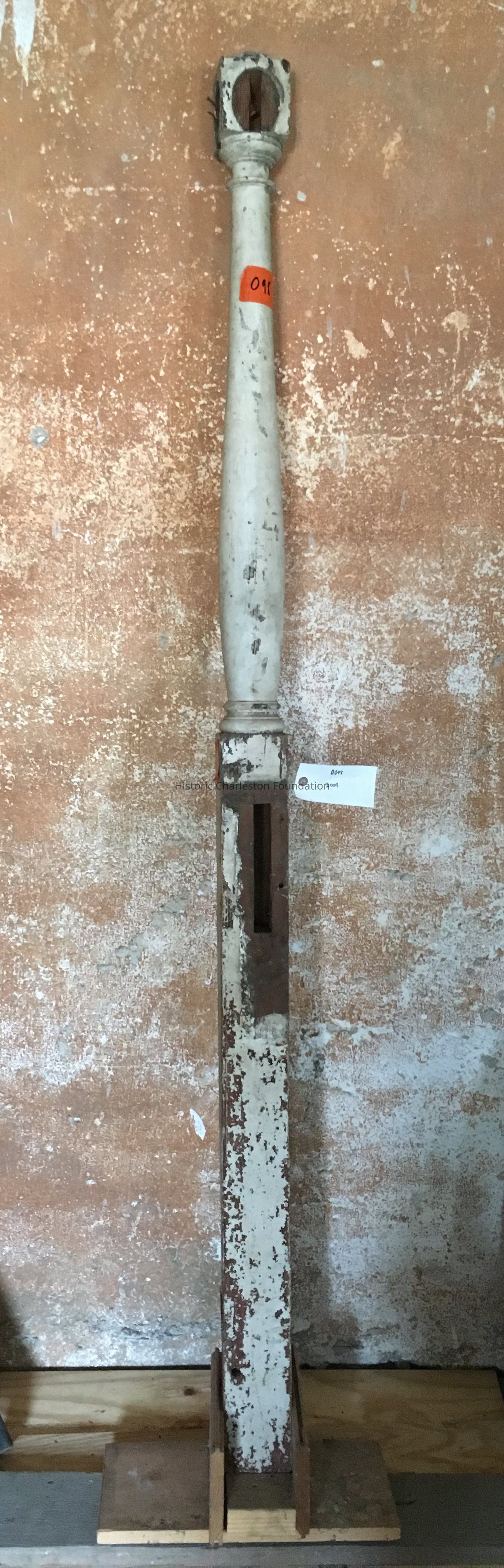 Newell post with two inverted slots. Upper portion square, then turned. Rectangular base. Paint chipped.Collection