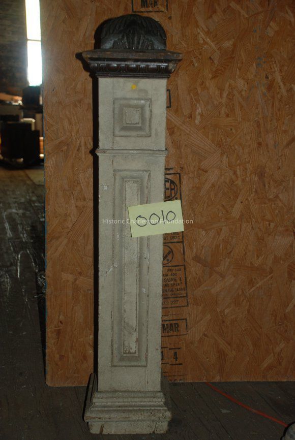 Wood newel post, Victorian, ca. 1880-1900. White painted shaft; stained wood top with floral design carving.Collection