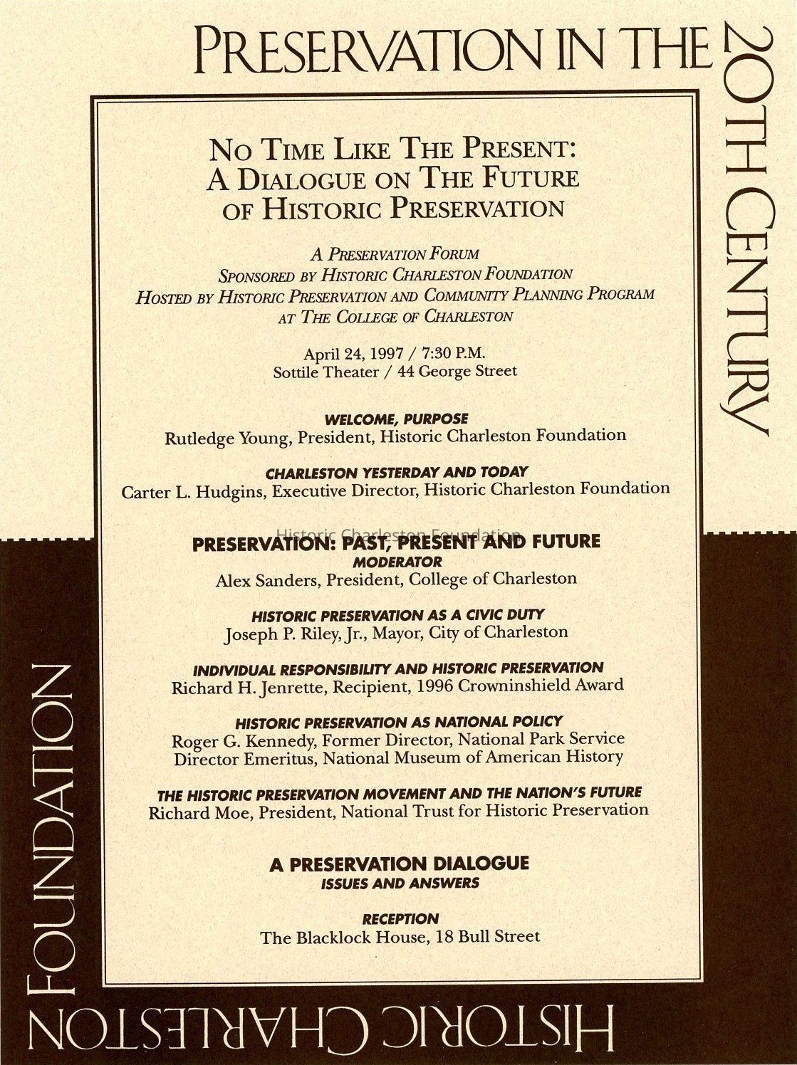 Preservation forum held April 24, 1997, at the Sottile Theater, presented in conjunction with Historic Charleston Foundation's 50th anniversary celebrations. Moderated by Alex Sanders, President, College of Charleston; with welcoming remarks by Rutledge Young, President, HCF; and introduction "Charleston Yesterday and Today" by Carter L. Hudgins, Executive Director, HCF. Followed by four presentations and a question-and-answer dialogue.
