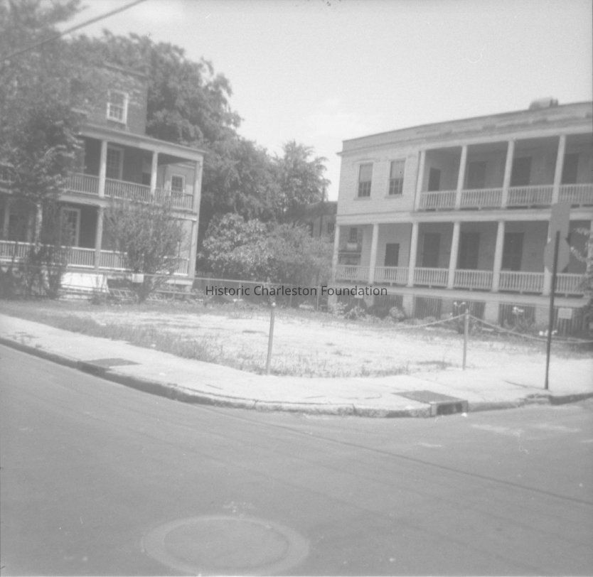 B&W photograph of the empty lot at the northeast corner of Hasell and Anson Streets. Bordered by 44 Hasell Street and 34 Anson Street.