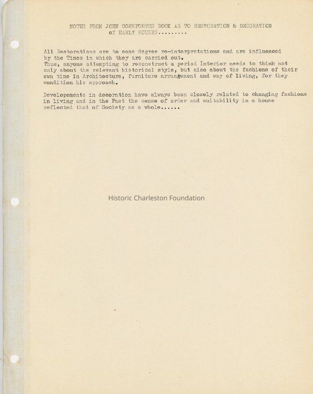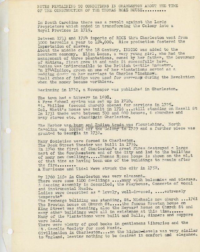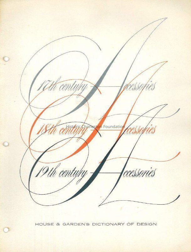 Notebook containing research materials pertaining to preservation in Charleston, Charleston history, and the decorative arts (e.g., porcelain, furniture, mirrors, etc.). Includes research notes likely written by Juliette or Henry P. Staats, newspaper articles, and magazine articles, including House & Gardens Dictionary of Design bound articles "The Boisterous Brilliant 17th Century," "18th Century: The Great Age in Design," "17th Century Accessories, 18th Century Accessories, 19th century Accessories," and "the Ambitious Busy 19th Century." Also includes research related to the Thomas Rose House (59 Church Street) and a booklet "Oriental Lowestoft" by Horace w. Gordon and Elinor Gordon.Collection
