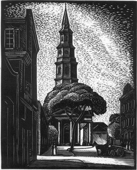 Portrays through wood engravings. Features St. Philip's Church; a Goose Creek marsh; East Bay Street; a Charleston window; the Old Glebe House; St. Michael's Church; Middleton Place; Anson Street; the Blacklock House; Charleston Rooftops & Fort Sumter; a Charleston doorway; old graves; St. Andrew's Church (Berkeley County); the Powder Magazine; mosquito fleet; the Edwards House; the Simonton Gateway; the Pink House; Catfish Row; a Washington House window; Tradd Street; Pirate House; Cool Blow (village scene); and Charleston across the bay.