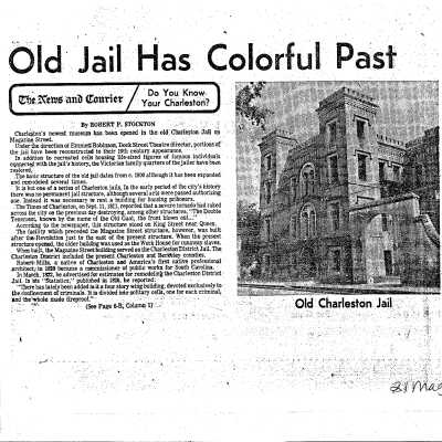 Folder 1 contains historical report and event program from the 1994 presentation of the HABS documentation (1994); article by Robert Stockton "Old Jail Restored as Museum" (1976); excerpt from "Robert Mills: Architect in SC"; newspaper articles (including undated, 1978, 1985 DYKYC); building history from Information for Guides of Historic Charleston; illustrated trifold card with brief historical notes; copy of 1835 plat.