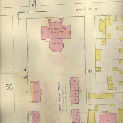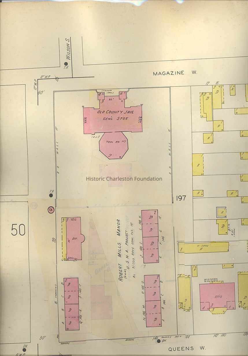 Constructed 1802; alterations 1820s; wings constructed 1855. Improvements by Robert Mills, architect; wings constructed by Barbot and Seyle. The 4 blocks surrounding the city jail were designated in 1680 as public lands and have long been the location of institutions serving the poor, the sick, and the dispossessed. In addition to housing a series of powder magazines that were erected on Magazine Street beginning in 1737, this land was used as a public burying ground, the poorhouse, the marine and other hospitals, the workhouse, and the jail. In his Statistics of South Carolina, published in 1826, Robert Mills describes the institutions of this block: "Lunatic Asylum - This benevolent institution was founded in 1822; the building is now ready for the reception of patients; it will contain 150, nearly all in separate rooms; the plan of the building is such as to admit of any extension, without departure from the original design...The original act of Legislature making appropriations for a Lunatic Asylum including also an Asylum for the Deaf and Dumb...The public prison is situated on Magazine Street...It is a large three story brick building with very roomy and comfortable accommodations...There has been lately added to it a four story wing building, devoted exclusively to the confinement of criminals. It is divided into solitary cells, one for each criminal, and the whole made fire proof. A spacious court is attached...Very good health is enjoyed by the prisoners. The work house, adjoining the jail is appropriated entirely to the confinement and punishment of slaves. These were formerly compelled only occasionally to work; no means then existing of employing them regularly and effectually. The last year the City Council ordered the erection of a tread-mill; this has proved a valuable appendage to the prison, and will supercede every other species of punishment there." The building was renovated by the architects Barbot and Seyle in the 1850s. Until the earthquake of 1886, the design also included a substantial tower. The wing described by Mills was his own design, but it was replaced by the 1850s wing, which remains. Union troops, including the remnant of the 54th Massachusetts Regiment, were quartered here during the Civil War. The facility served as the county jail until the 1930s and later became the property of the City Housing Authority of Charleston. Since 2000, after sitting vacant for over 60 years, it served as the downtown campus of the American College of the Building Arts until 2016. (Poston, Buildings of Charleston.)