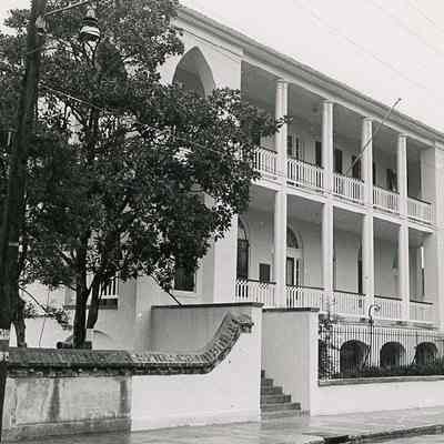 HCF tour description taped to the back of Photo B: "Again this is a study print. Included in this overall area are many outstanding buildings, one of the finest of which is the Old marine Hospital on 20 Franklin Street, designed by Robert Mills, and dating from 1833. In our survey, This is Charleston, it is listed as Nationally Important, the top category. It was restored as part of the Robert Mills Manor and is used by the Housing Authority of the City of Charleston. While this area has none of the very oldest houses in Charleston, it is representative of many styles and periods, and illustrative of the continuing history of American Architecture."