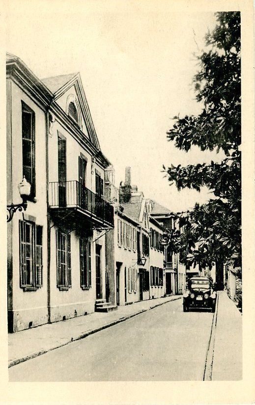 Photographic postcard of St. Michael's Alley looking east from the James L. Petigru Law Office (8 St. Michael's Alley), showing the south side of the street.