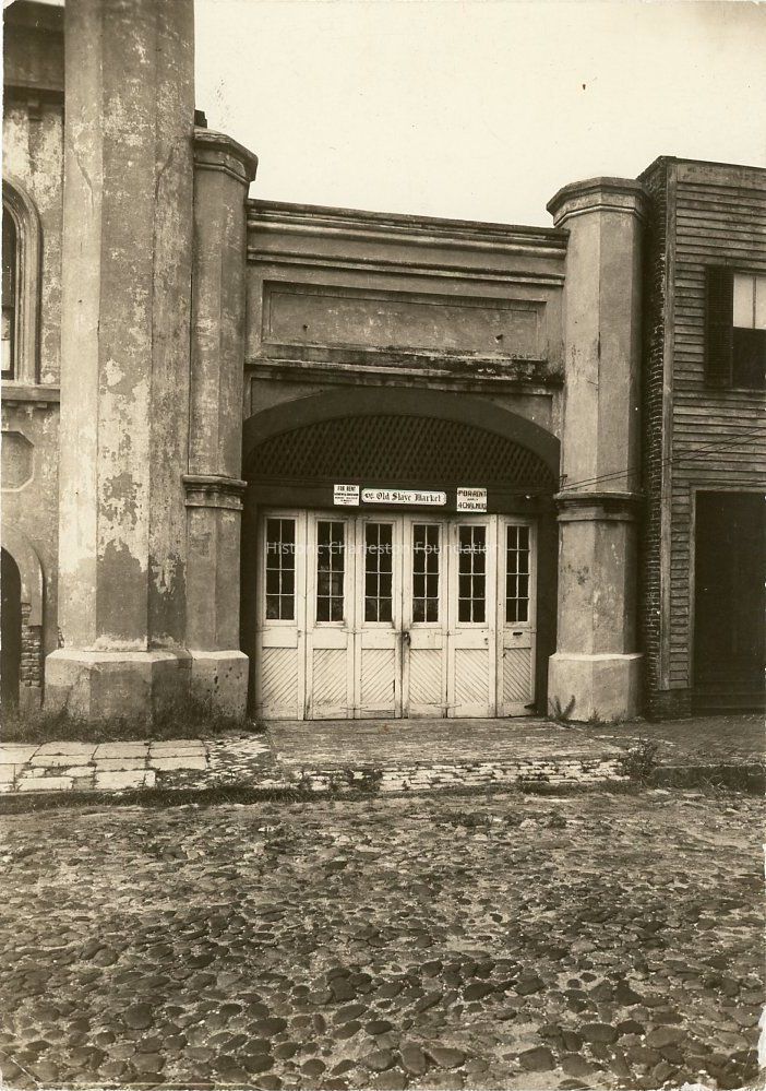 B&W photograph of "The Old Slave Market" taken when the building was for rent. View from across the cobblestone street.