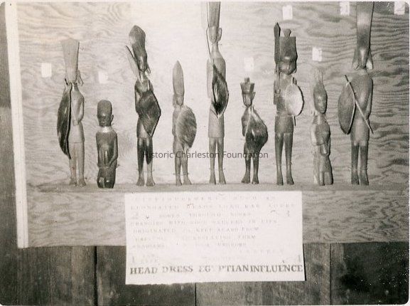 e: Exhibit featuring artifacts representing "head dress Egyptian influence."
