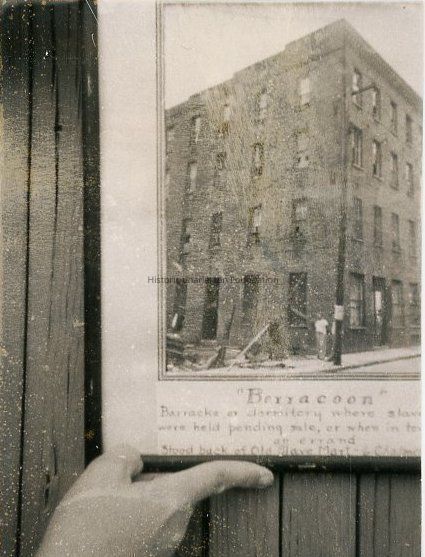 f: Framed photograph of "Berracoon" where slaves were held pending sale.