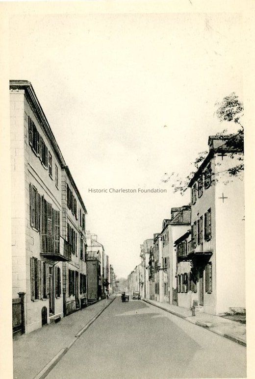 Photographic postcard of Tradd Street looking east from the Col. George Chicken House (49 Tradd) and the William Vanderhorst House (54 Tradd).
