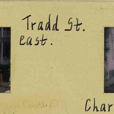 Color stereoscope slide* of a view looking north on Orange Street from Tradd Street. East elevation of the Col. John Stuart House (106 Tradd) at left.