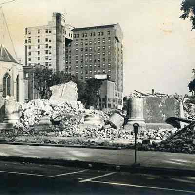 b: Bricks and other debris from the demolition of the Charleston Orphan House Chapel. Rear of the Francis Marion Hotel in background. Two copies of photograph in sleeve.