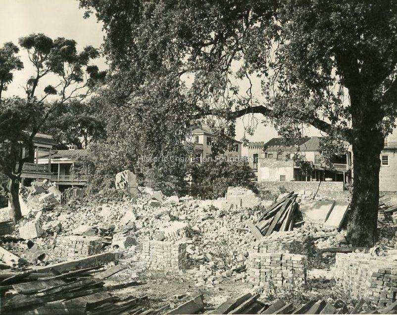 c: Bricks and other debris on the site of the Charleston Orphan House after its demolition. Also shows 8 Vanderhorst (left), the rear of Aimar Building (409 King Street) (right-of-center), and a portion of the wing of the old Citadel that was later torn down for construction of the library at 404 King Street.Collection