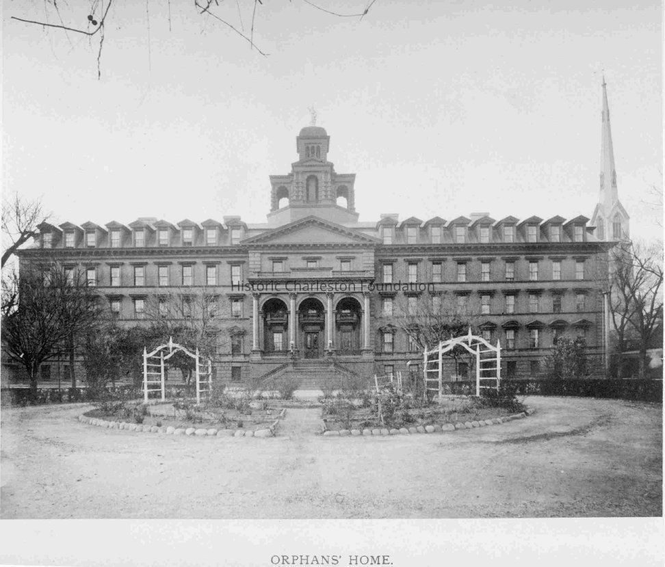Charleston Orphan House (Calhoun Street), front elevation. Garden with trellises in foreground.Context