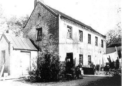 B&W reprint of photograph of the kitchen-laundry dependency at the rear of 132 Church Street (Douxsaint-Macaulay House), corner view. Brickwork with dogtooth cornicing relates it to the post-Revolutionary period.Collection