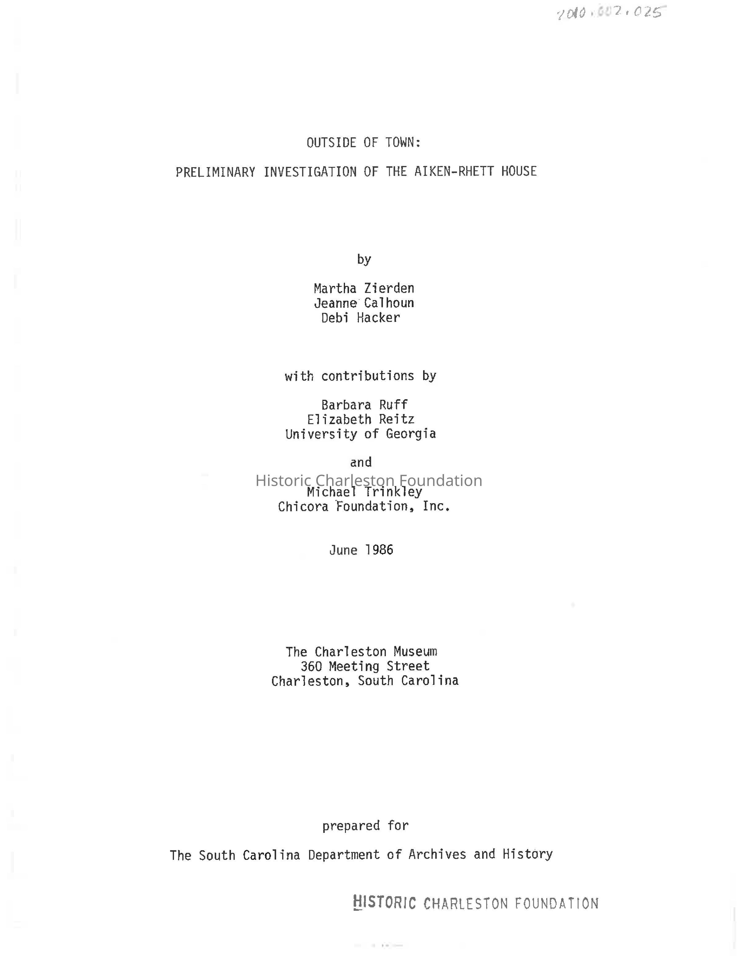 Outside of Town: Preliminary Investigation of the Aiken Rhett HouseEntry/Object ID