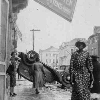 Silver gelatin photograph of an overturned car in front of 57 Broad Street, after the tornadoes of September 29, 1938.Photograph Details