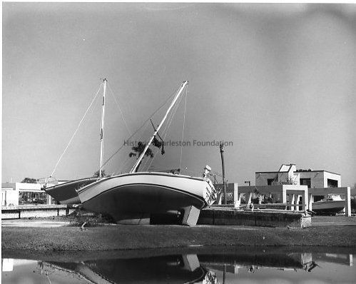 Two B&W photographs of overturned sailboats at a Sullivans Island condominium near the Ben Sawyer Bridge after Hurricane Hugo.Collection