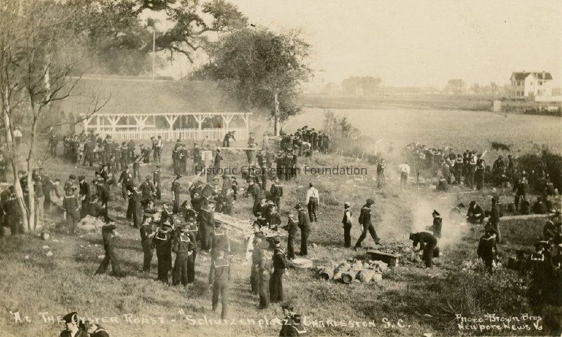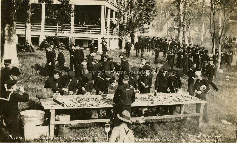 b: Captioned "View of the Oyster Roast - Charleston S.C." Sailors are gathered at the shucking table. The structure known as "The Lodge" is at upper left of photo.