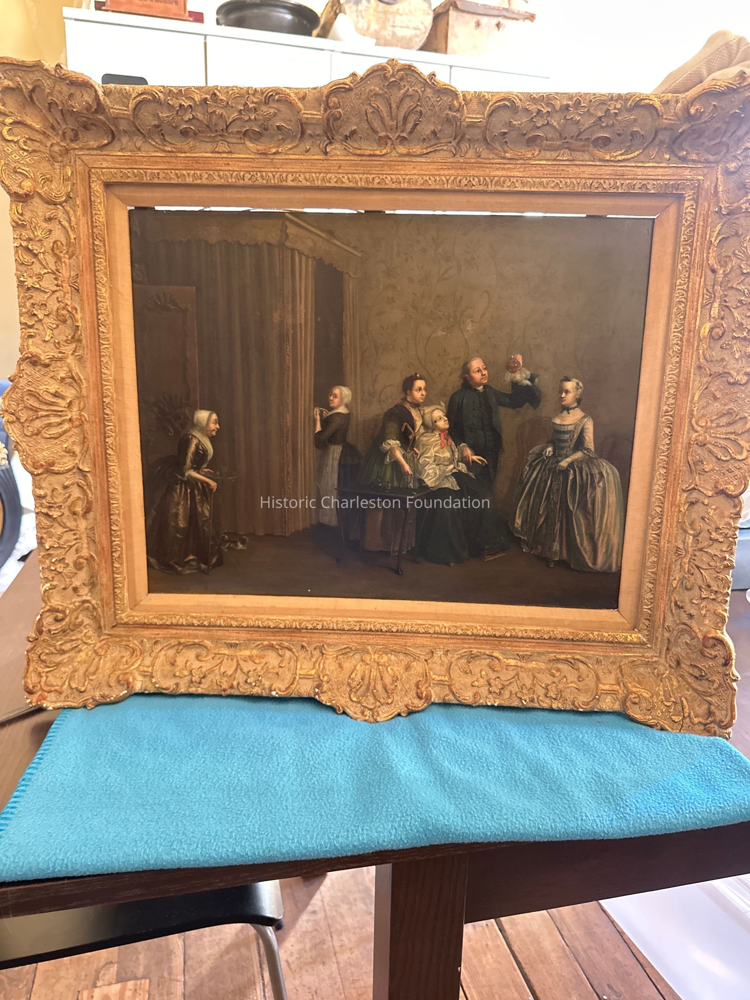 Conversational painting, artist unknown, European, late 18th early 19th century, Oil on board, depicting six figures in bedroom setting, center area of canvas showing doctor attending patient, young girl seated in chair, doctor holds patients writst, other hand holding speciment bottle, figure standing behind patient, chamber maid, grandmother and far right visitor.Collection