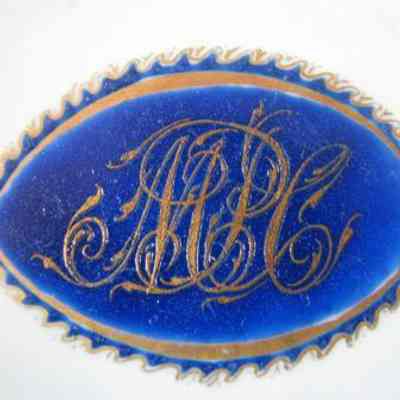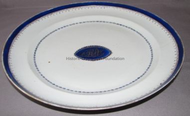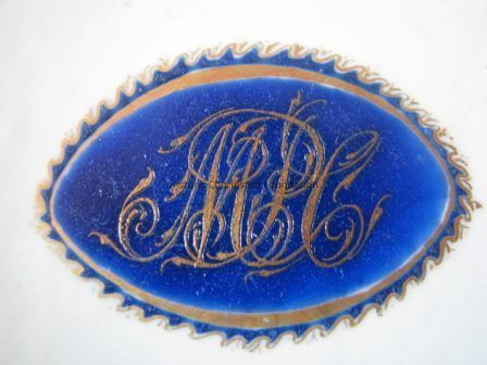 Pair of Chinese Export Porcelain Blue and Gilt Plates with Blue Band Outer Borders and Interior Border of Blue Dots and Gilt Lines. Pointed Oval Medallion in Center with Colbalt Background and Monogram Mpc. Verbal History of Ownership By Charles Cotesworth Pinckney Who Married Mary Stead in 1785.Collection