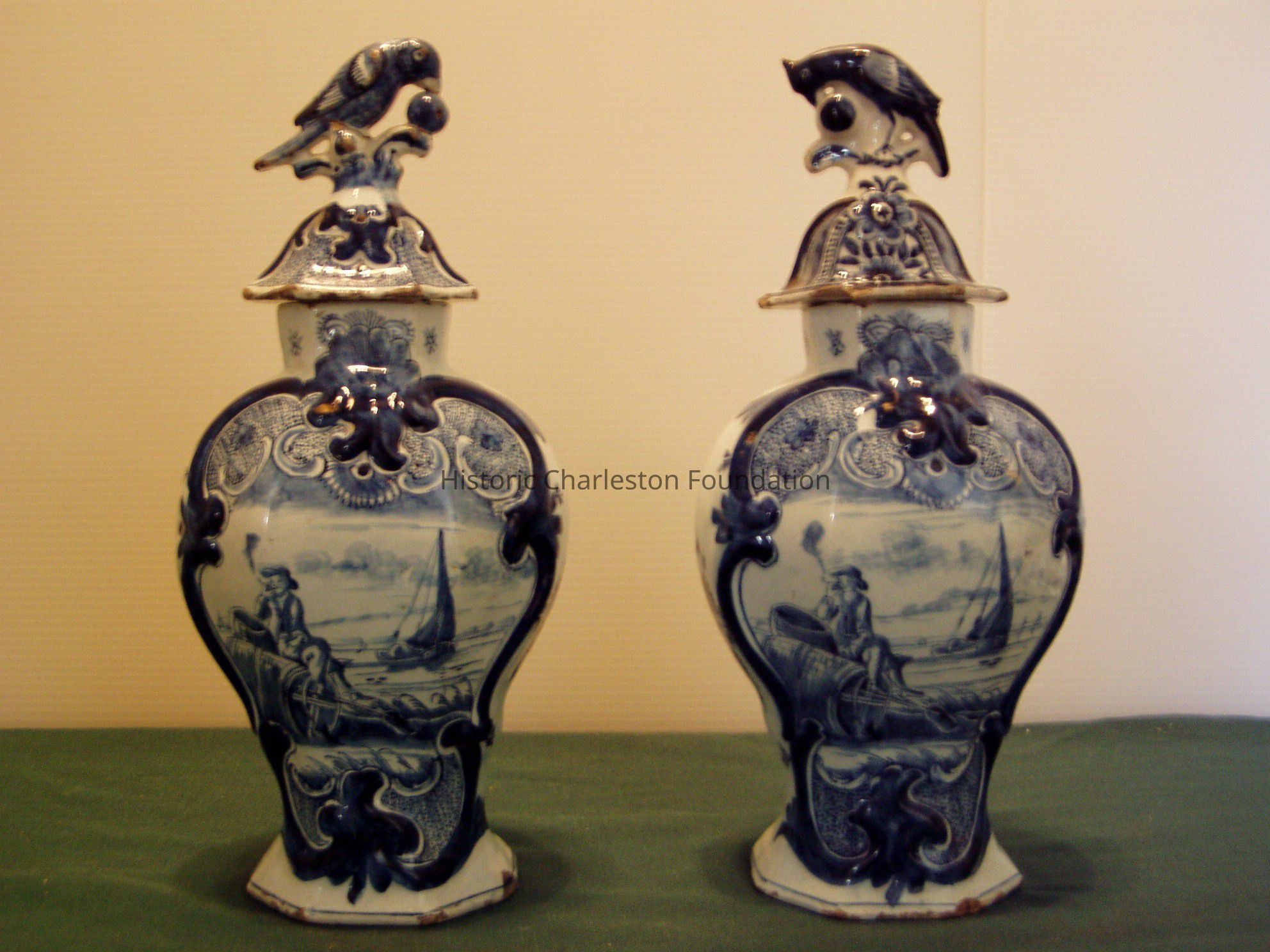 Pair of Covered Delftware Vases From a C.1760 Garniture, Dutch, with Painted Decoration in Underglaze Cobalt. Molded Scroll Cartouche on One Side of Each Frames a Painted Scene Depicting a Sailboat At Right with a Man Smoking a Pipe and Leaning on Two Barrels on the Left. Covers with Bird Finials. Both Marked in Underglaze Blue on BaseCollection