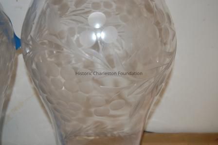 Leade Glass Hurricane Shades Etched with Band and Stylised Leaves At Top and Bottom. Center Is Etched with Continuous Vine with Leaves, Berries and Flowers.Collection