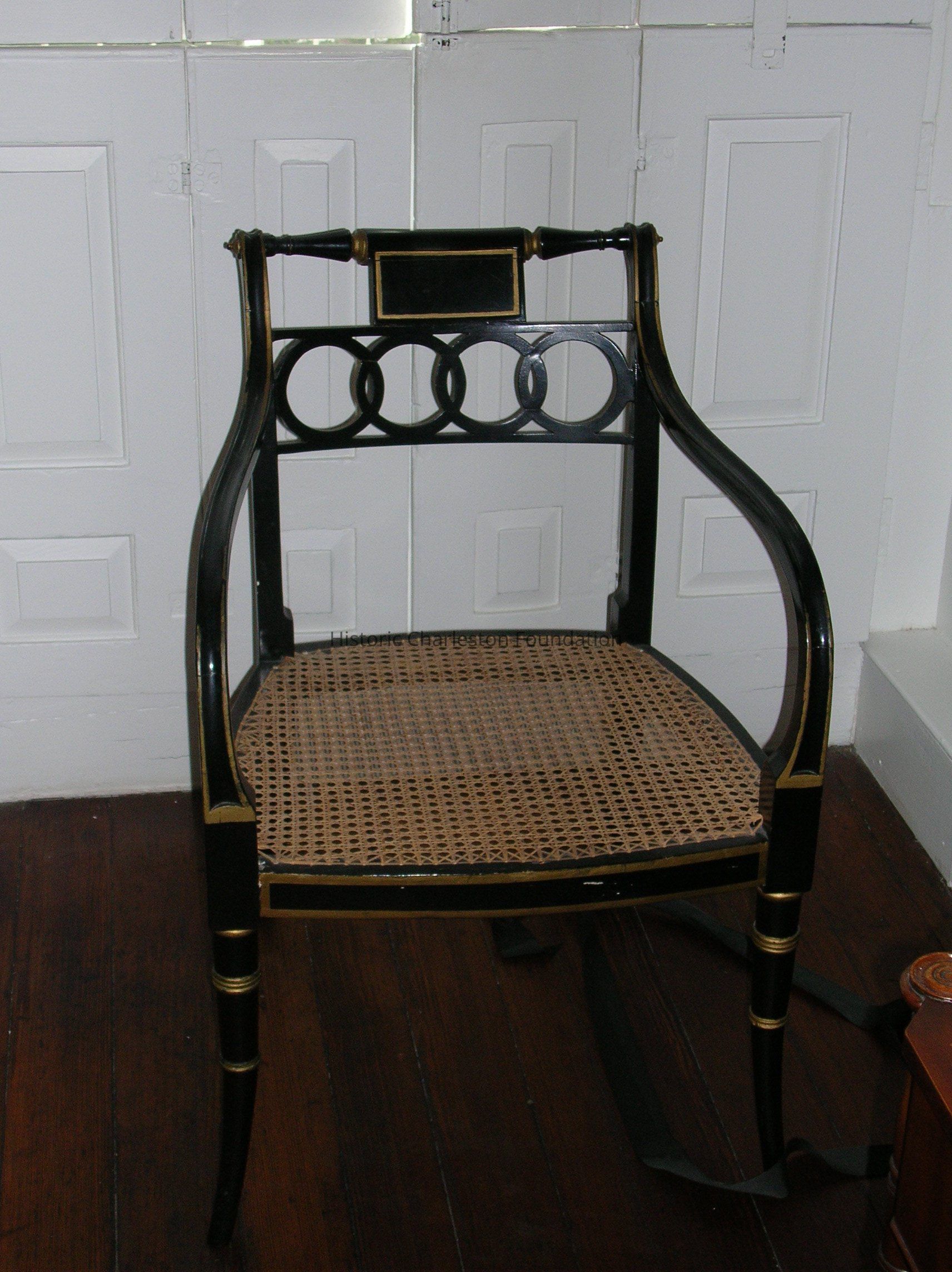 Pair of Painted and Gilt Wood English Armchairs, C.1800, Regency/George III. with History of Ownership in the Allston Family. Match 92.4.1-2. Rush Seat Open Armchairs with Slightly Curved Back, Downswept Arms and Caned Seats on Slightly Flared Tapered Legs. Square Panel on Crest Rail and Back Rest of Interlocking Open Rings. Chairs Have Been Stripped and Restored and Are Presently Painted Black. No decoration in central panel.Collection