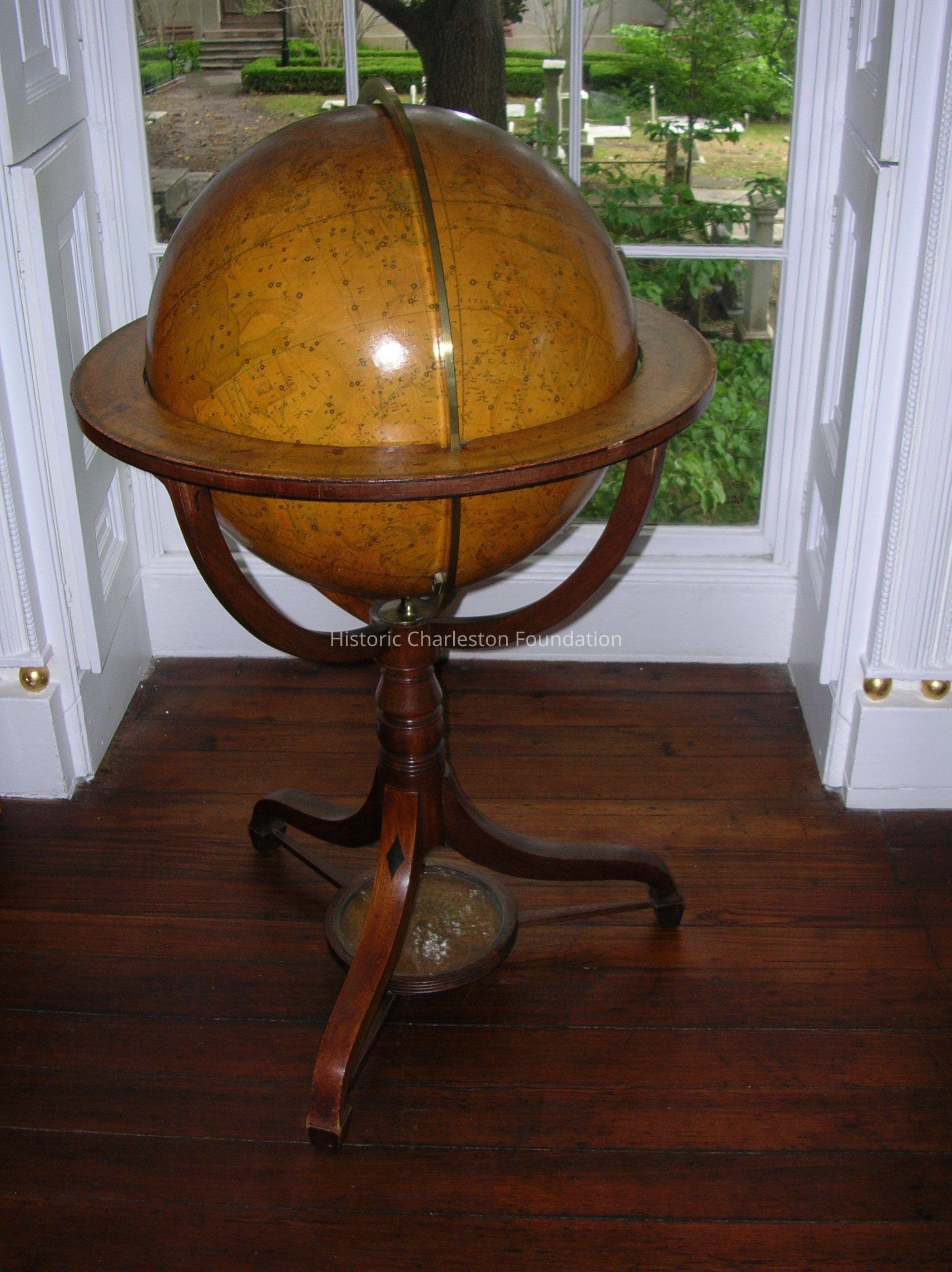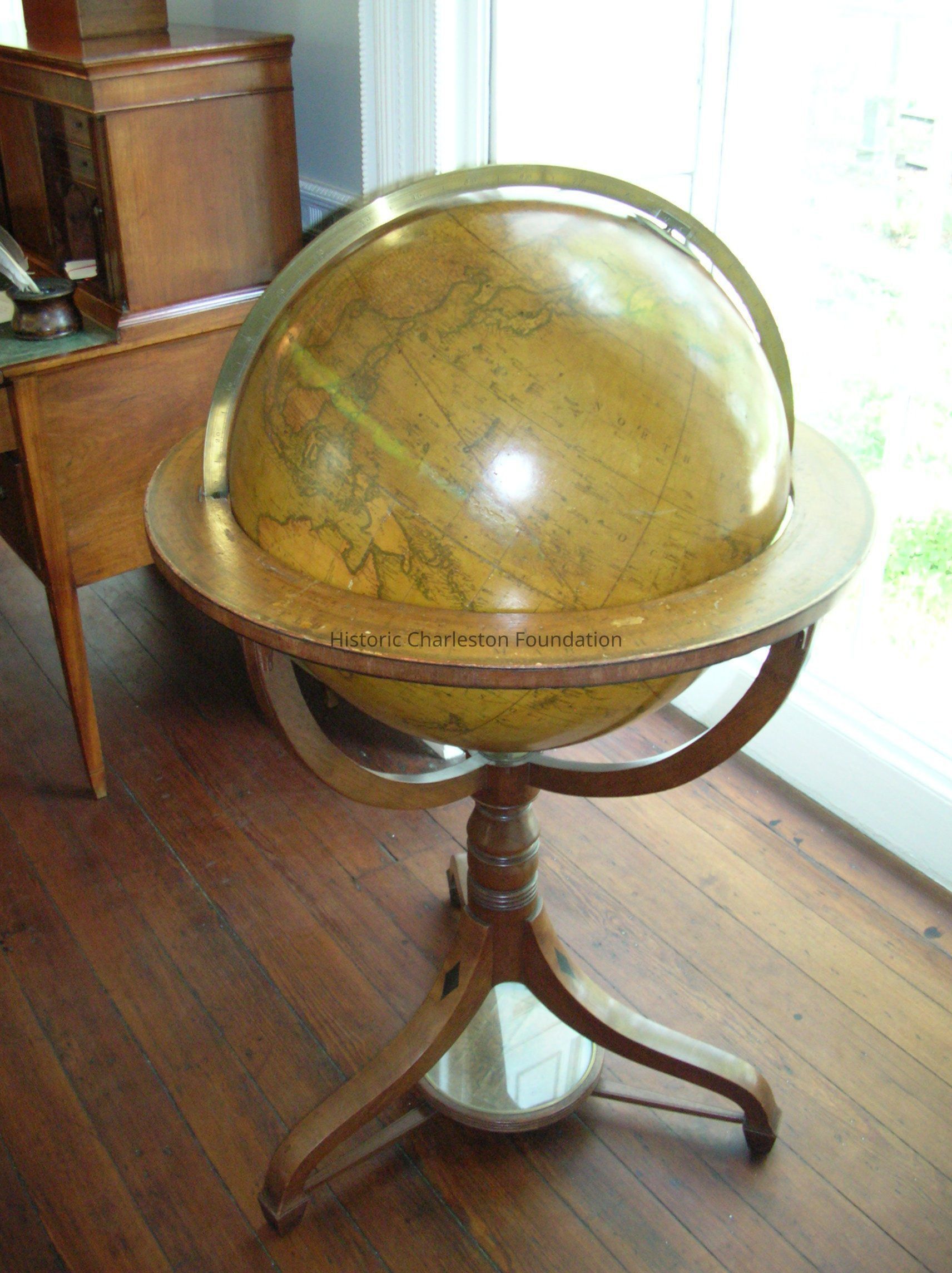 Pair of globes on tripod stands, one celestial, one terrestrial. Sheraton style frame. Both with tripod stand with turned standard, and downswept legs with spade feet, each with dark wood diamond inlay. Stretchers with glass-covered compass.Context