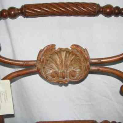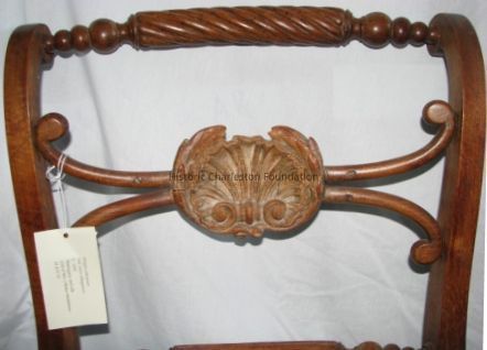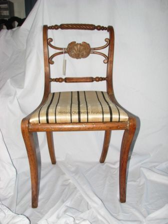 , with Sabre Legs, Turned and Molded Crest Rails with Spiral Turned Central Element. Horizontal Splats with Deeply Carved Shells Below Which Are Turned and Molded Horizontal Braces. Slip Seats Covered in Black, Gold and Lemon Stipe Modern Silk.Collection