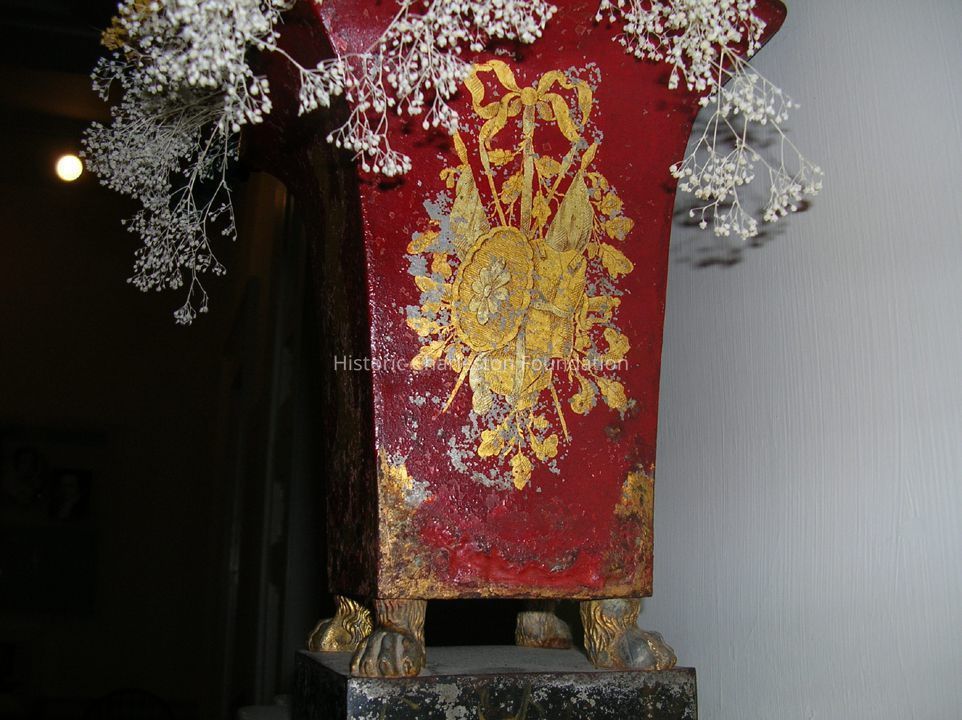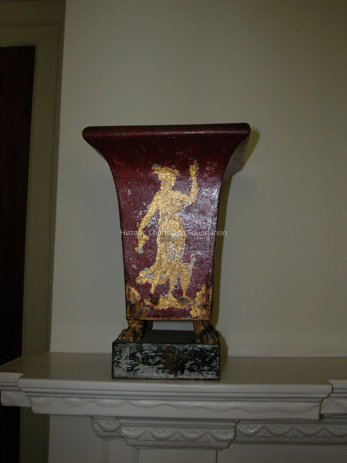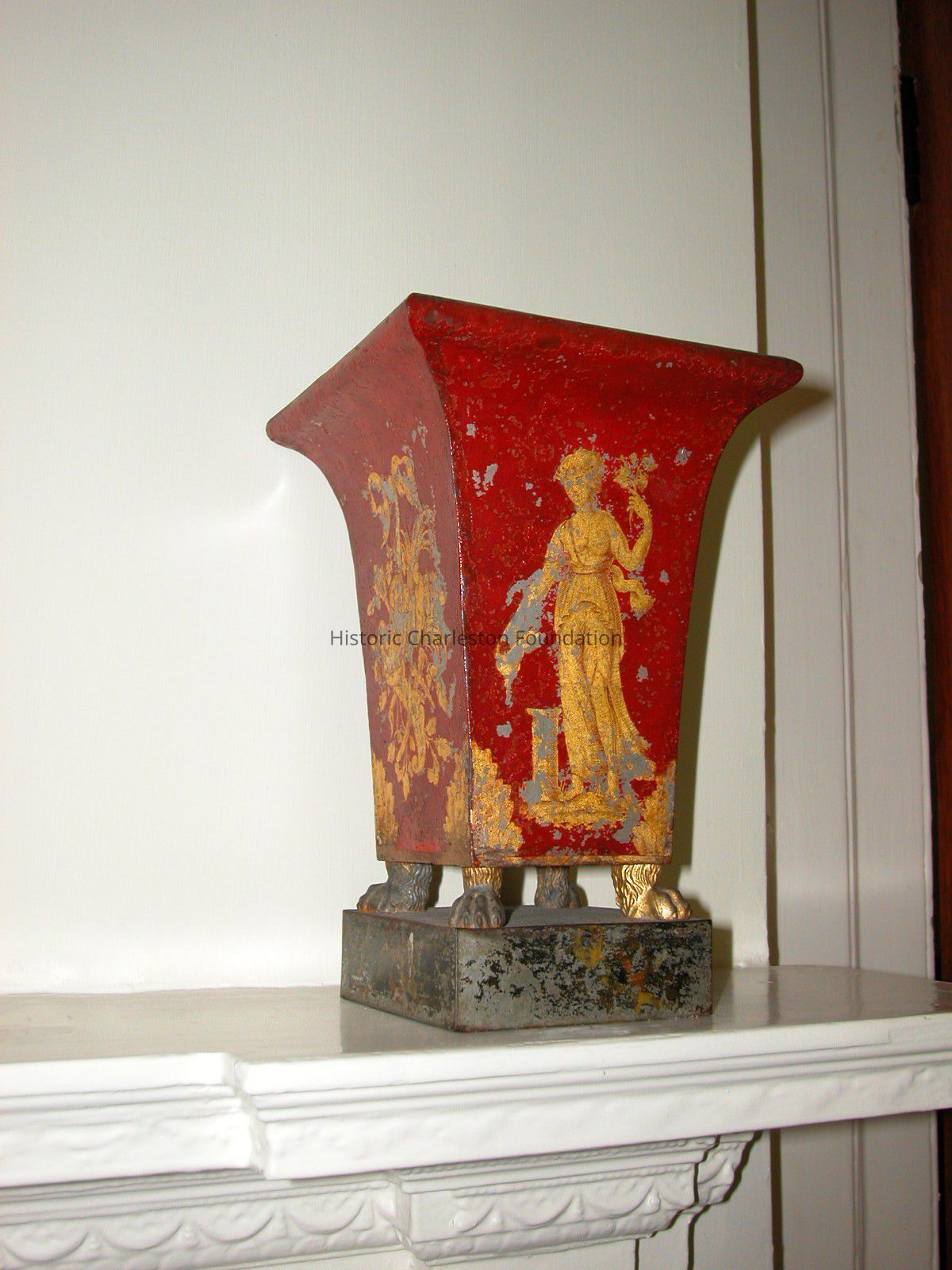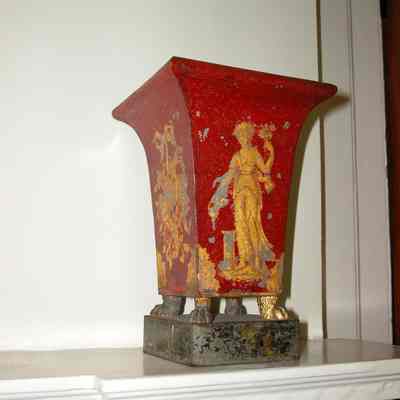 Tole Cache Pots, Red with Gilt Decoration, English Or European, Early 19th C. Pair with Four Sided Urn on Four Gilded Paw Feet on Square Black Painted Tole Bases with Gilt Floral Decoration. Urns Are Lacquered with Gilt Decoration of Neo-Classical Draped Female Figures on Front and Gilt Trophy Designs Hanging From Painted Ribbons on Two Sides.Collection