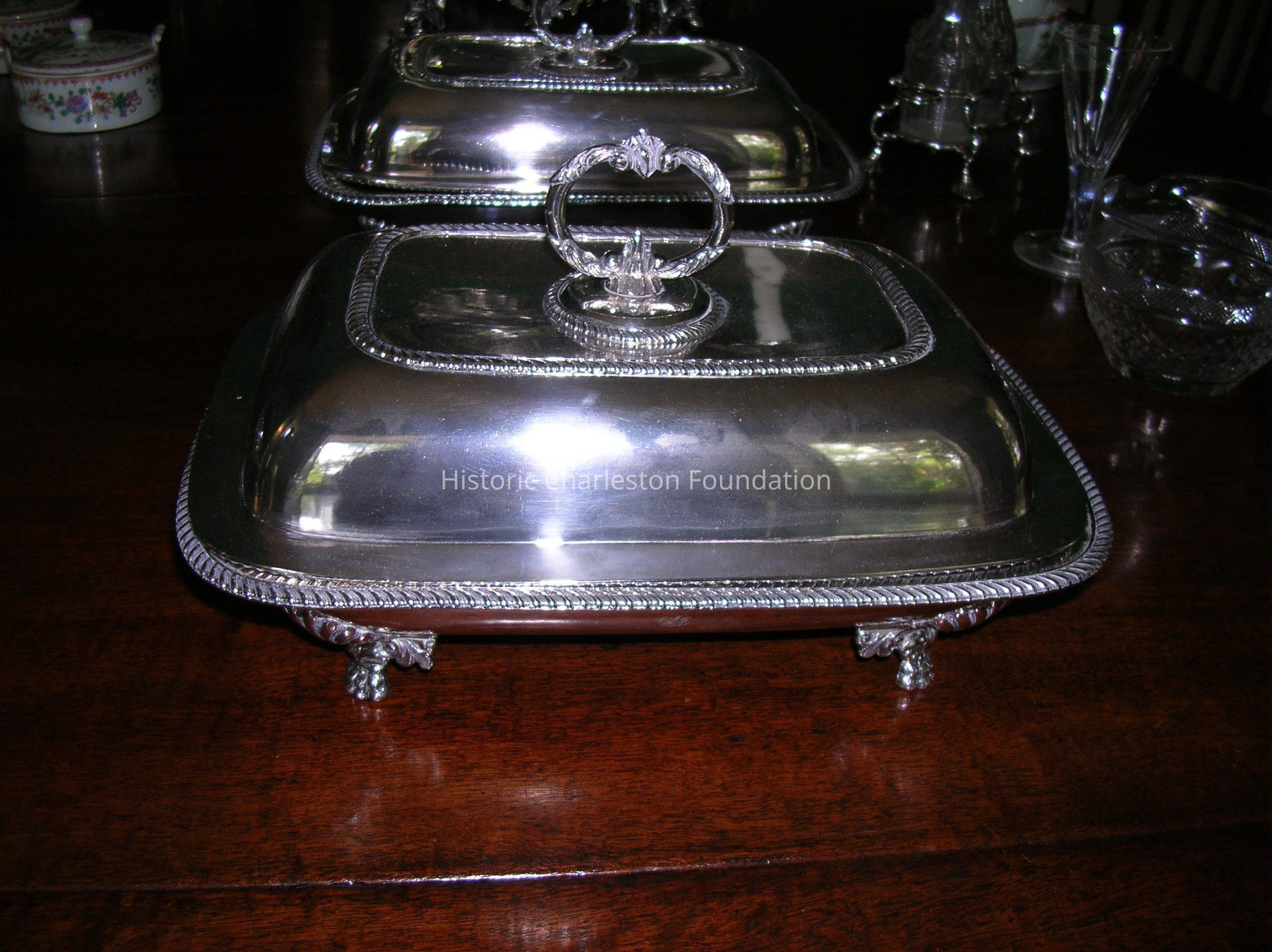 Pair of Silver Vegetable Dishes Marked P. Chitry, with Four Cast and Applied Feet with Shell Motifv. Dishes Have Gadrooned Edge and Each Is Engraved with Initials "Ej" on Side. Covers with Cast Oval Handles with Circular Gardrooned Edge. Gadrooning Around Edge of Covers. Chitry Was a Philadelphia Silversmith Working in the Early 19th C.Collection