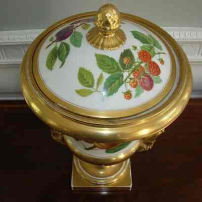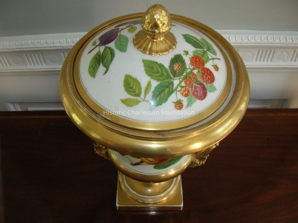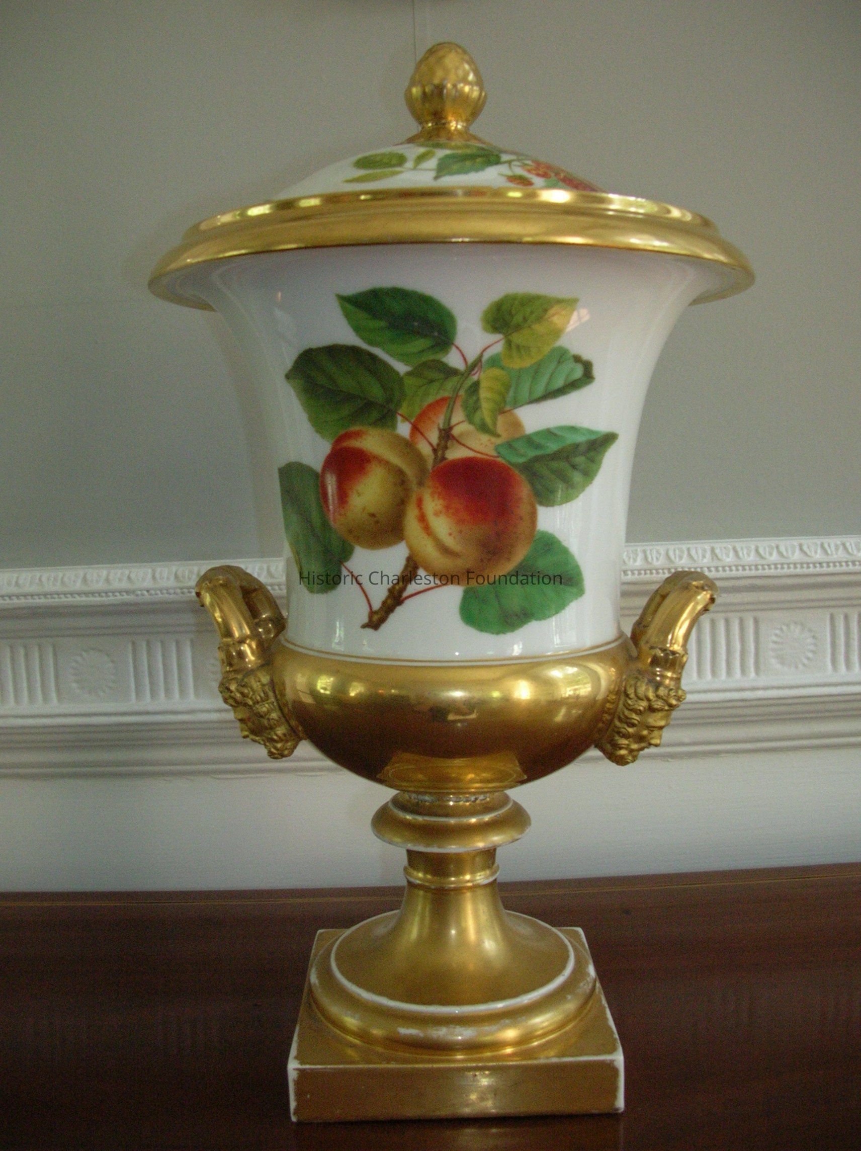 Pair of Porcelain Fruit Coolers C. 1815, Vieux Paris. Urn Shaped with Lid, and Porcelain Liners. Urns Rest on Square Gilded Base and Has Molded and Gilded Handles, Each Attached with Two Classical Masks. Round Lids with Facetted and Gilded Finials. Gilded Bands Around Lips of Urns, Liners and Lids. 58.26.1 Has Painted Decoration of Green Grapes and Peaches. Lid Painted with Plums and Raspberries. 58.26.2 Has Decoration of Peaches and Purple Grapes. Lid Painted with Cherries.Collection