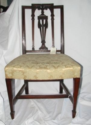 Square back Sheraton style side chairs. Central splat with three vertical members joined by swag and fluted rectangular panel mounted by Prince of Wales feathers. Exposed pins in corners of crest rail. Tapered legs terminating in spade feet. Side, rear and cross stretchers. Upholstered in yellow silk.Collection