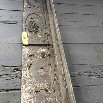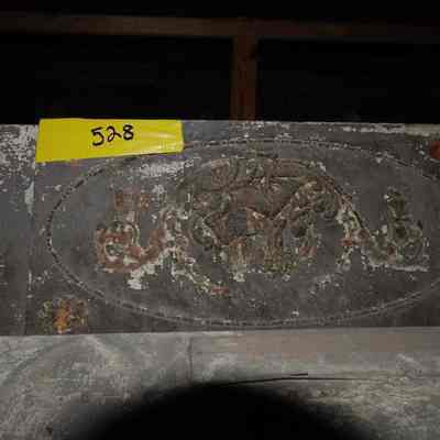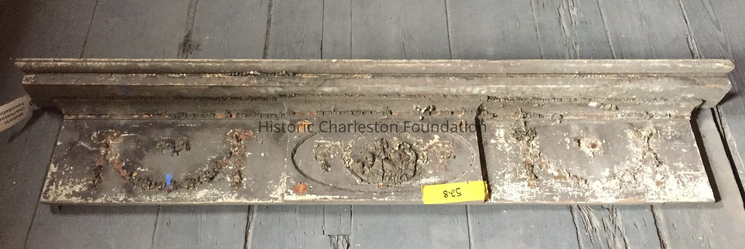 Pediment (or mantelpiece) with wood and composite detailing. Some wooden detail is missing/chipped; paint chipped. Fair/below average condition.Collection