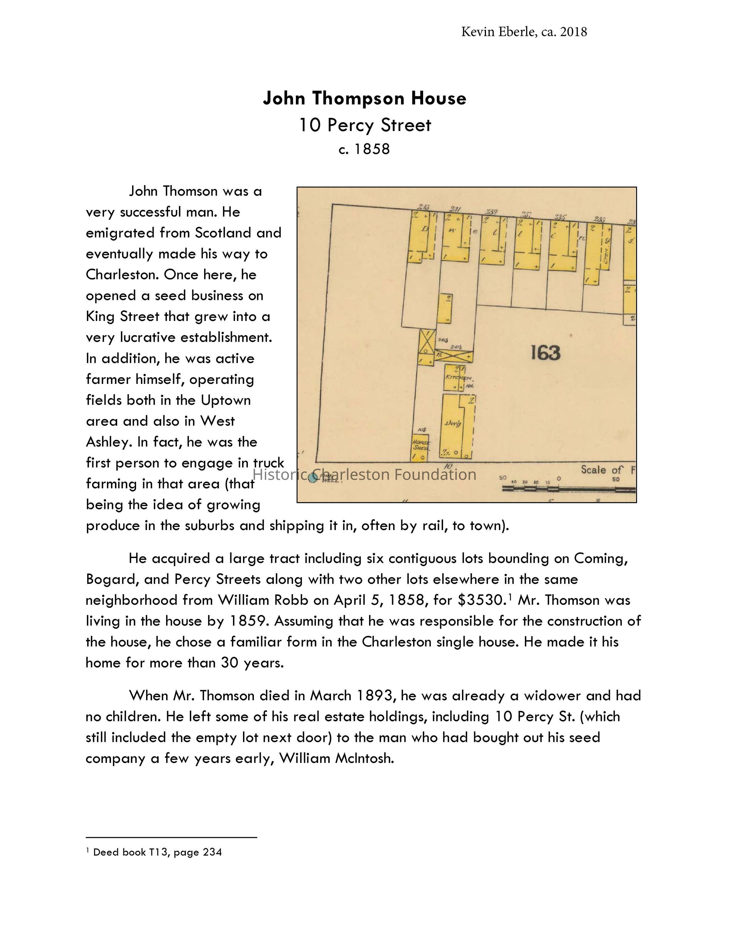 Constructed ca. 1858. John Thompson, who emigrated from Scotland and eventually made his way to Charleston, opened a seed business on King Street that grew into a lucrative establishment. He was an active farmer himself, operating fields both Uptown and in West Ashley, and was the first person to engage in truck farming in that area. He acquired a large tract bounded by Percy, Coming, and Bogard, and was living at 10 Percy, a Charleston single house, by 1859.