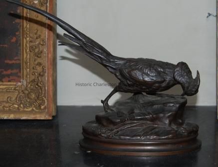 Pheasant-figure, bronze, on rock formation with butterfly and wheat on oval stepped base, dark brown patina. Signed ARSON, Alphonse Alexandre Arson, France, b. 1822 d. 1880.Collection