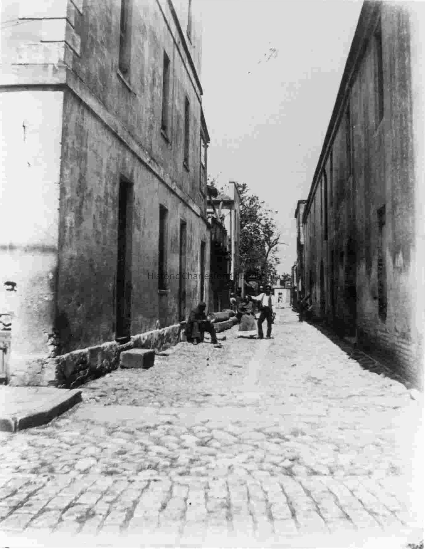 Photo is identified as Philadelphia Alley. Originally identified as Horlbeck Alley (corrected by Mrs. Levkoff). Seated and standing African-American individuals are in the alley.Collection