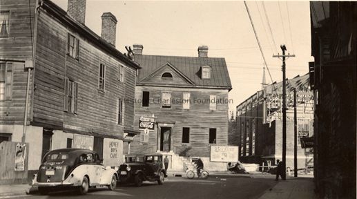 d: Houses/buildings on Logan Street near its end at Beaufain Street showing Honey Boy's Cafe (51 Beaufain Street) and 56 Beaufain Street can be seen in the background.