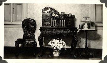 Four photographs of interior rooms of Charleston houses. Features framed painting of Confederate flags posed on a sofa (see also page 1); fireplace and mantel; various types of chairs; pedestal tables; and an ornately carved bookcase and chair.