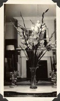 Gladiola arrangement on mantel in front of mirror; interior room of 120 Wentworth Street.Collection