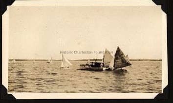 Four photographs of boats on the water in the Charleston Harbor. The boats in Photo B are docked, with Halsey Lumber Mills building (now gone) in background.Collection