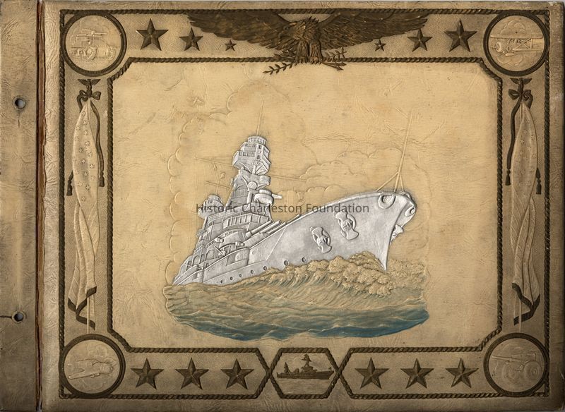 Photograph album with leather cover containing 60 leaves. Cover embossed with large battleship in the center and other military symbols in the borders. Cover and leaves are bound by string through 2 holes at the left side of album. Contains black and white photographs of various Charleston residences, landmarks, sites, people, and battleships as well as other lowcountry places. Many photos are identified by handwritten captions in white ink on the black paper. Photos are fixed to the page in photo corners. Some photos are missing. Most pages contain 3-4 photos. Some photos are dated and some are initialled "W.M.M."