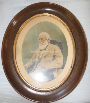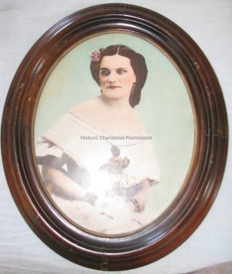 Two oval framed photographs. One of Henrietta Aiken Rhett and one of her father, Governor William Aiken. Photograph of Henrietta Aiken Rhett is a half length photograph of a dark haired woman in a white off the shoulder dress, with a flower in the center of the bodice and another in her hair. Photograph of Governor Aiken shows a man with full white beard, seated, wearing a tan suit with vest and brown gloves. Both photographs are colored and have a pale green background.Collection