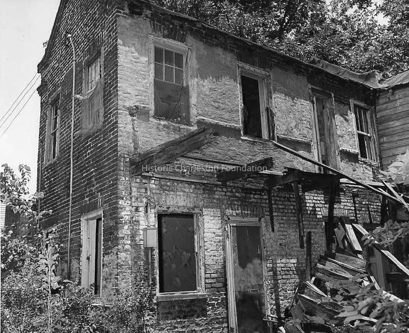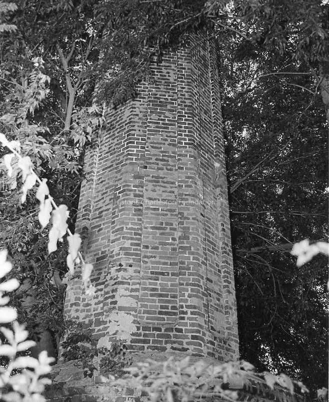 d: Exterior view. Captioned "Part of a large chimney, top of which, with tree growing out of it, can be seen in picture of entire building, and from Cooper River Bridge. Taken facing NE. 5/31/76."