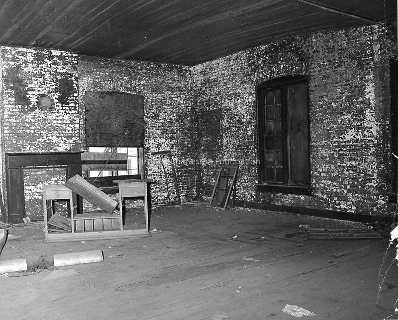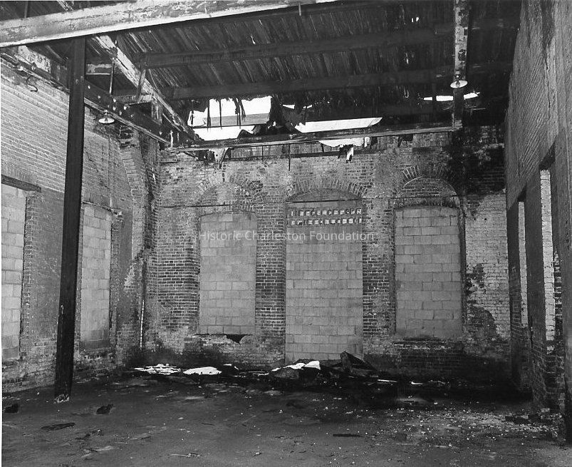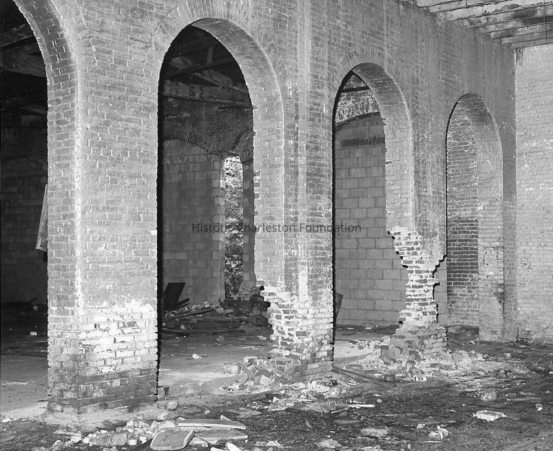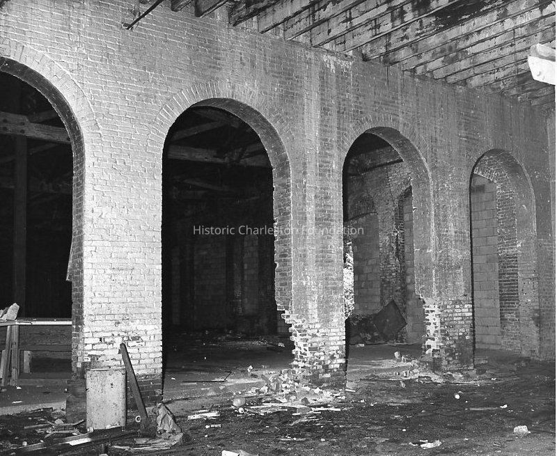 h: Interior view. Captioned "Arches on main floor, separating two-story front part of building and one-story rear. Also shows some details of brickwork--and vandalism. South side...taken facing north. 5/31/76."