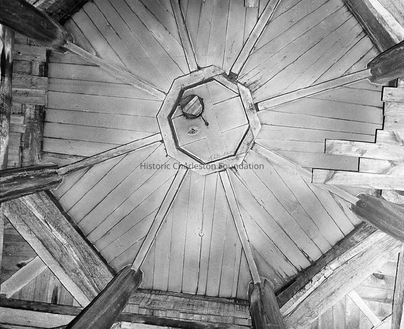 k: Interior view. Captioned "Timbers beside dome, taken from top of stairway to second floor. May 31, 1976. Looking NW."