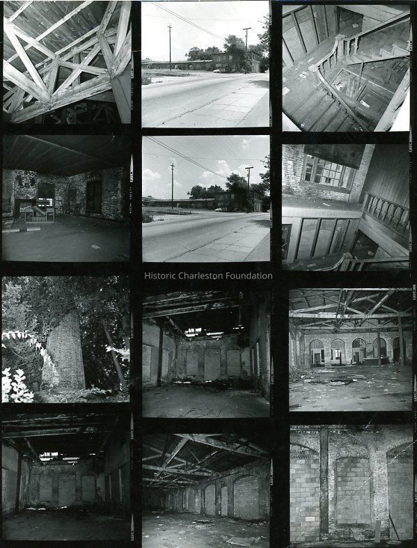 Four contact sheets for B&W photographs documenting the interior of 44 Line Street (South Carolina Railroad Car Shop). Two exterior shots on Sheet 1.