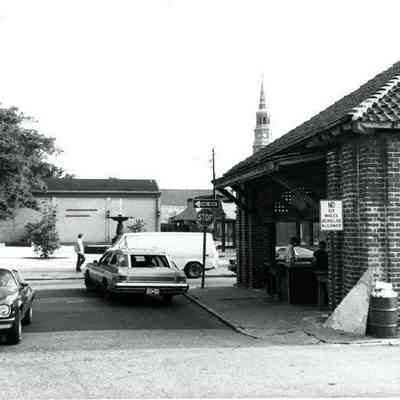s: Looking north on Meeting Street toward Market Street, from the parking lot of the White Horse Inn. The Golden Eagle Motor Inn next door is also in view.